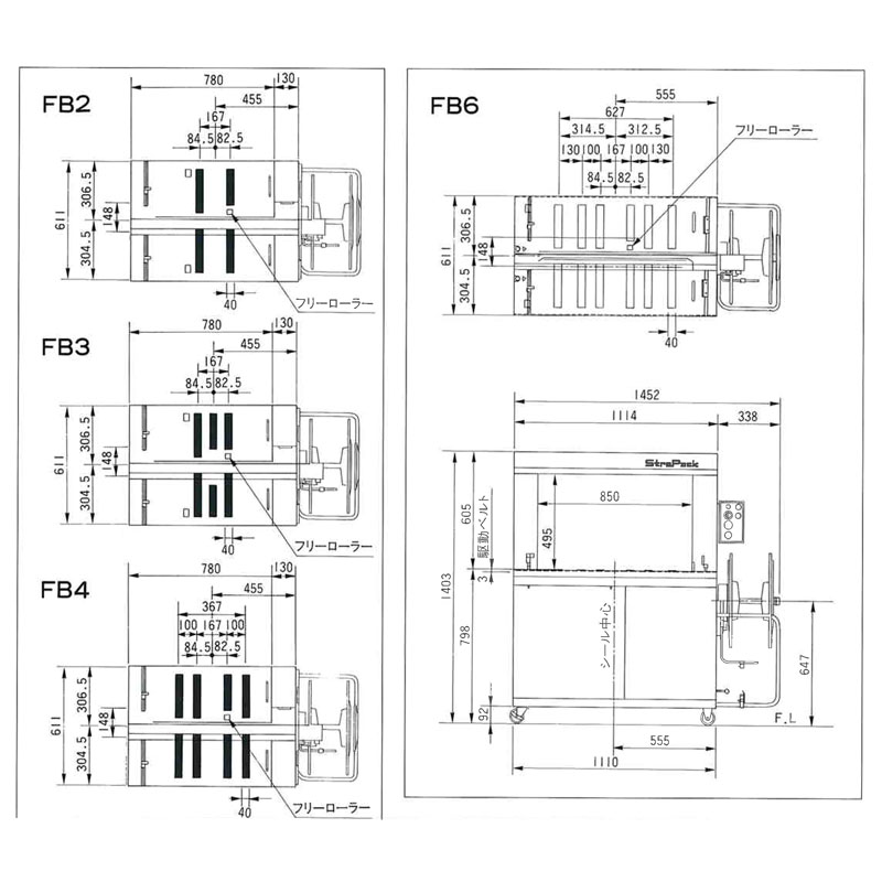 ◆FB6機型,前后桌面板上各有6根皮帶(一共12根)。適合捆扎大體積、大寬度、大高度的物體;